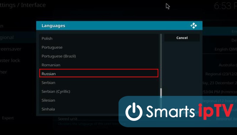 Устанавливаем русский язык. Для этого перейдите в Настройки (шестеренка) — Interface Settings — Regional. Нажмите на стройку «Language» и в выпадающем списке выберите «Russian». Дождитесь окончания установки.